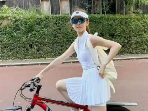 照片中章泽天身穿网球服搭配白色百褶短裙,脚踩运动鞋跨坐在自行车上比着剪刀手。