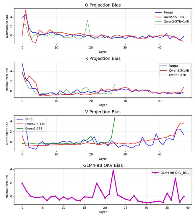 QKV 偏差分析显示,盘古模型和 Qwen2.5-14B 在三种投影类型(Q、K、V)上均表现出惊人的相似性。