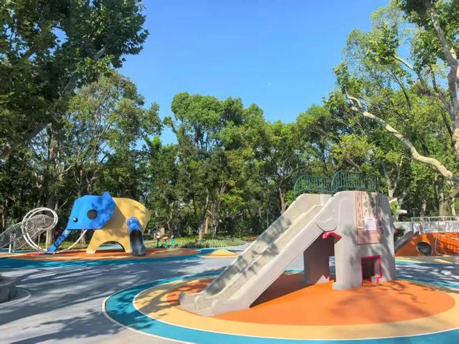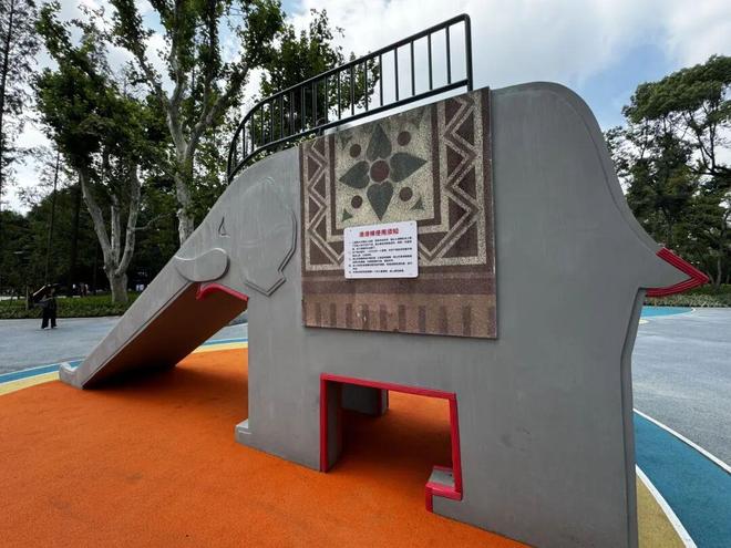 从杨浦公园隆昌路门进入,首先映入眼帘的就是“象素乐园”。橙蓝配色搭配简单线条,勾勒出一头活泼可爱的大象。步入其中,约2000平方米的宽阔场地化身孩子们的欢乐海洋。要说乐园里的大明星九游体育,那一定是这座年过花甲却依然焕发青春活力的水磨石大象滑梯。