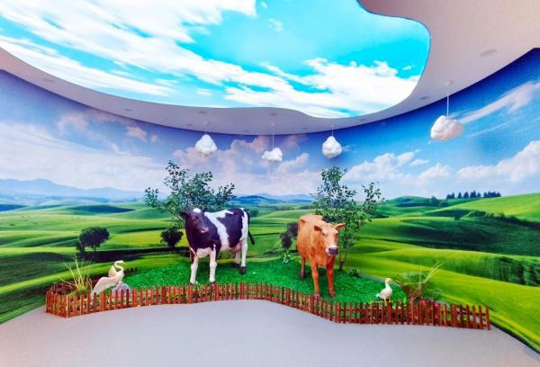 2、奶牛饲养展区:打造一个模拟奶牛养殖场的环境,展示奶牛的生活空间、饲养设备等。同时,通过展板介绍乳业奶牛的品种、饲养方式、健康管理等知识,还可设置互动屏幕,让参观者了解奶牛的日常饮食、作息等信息。